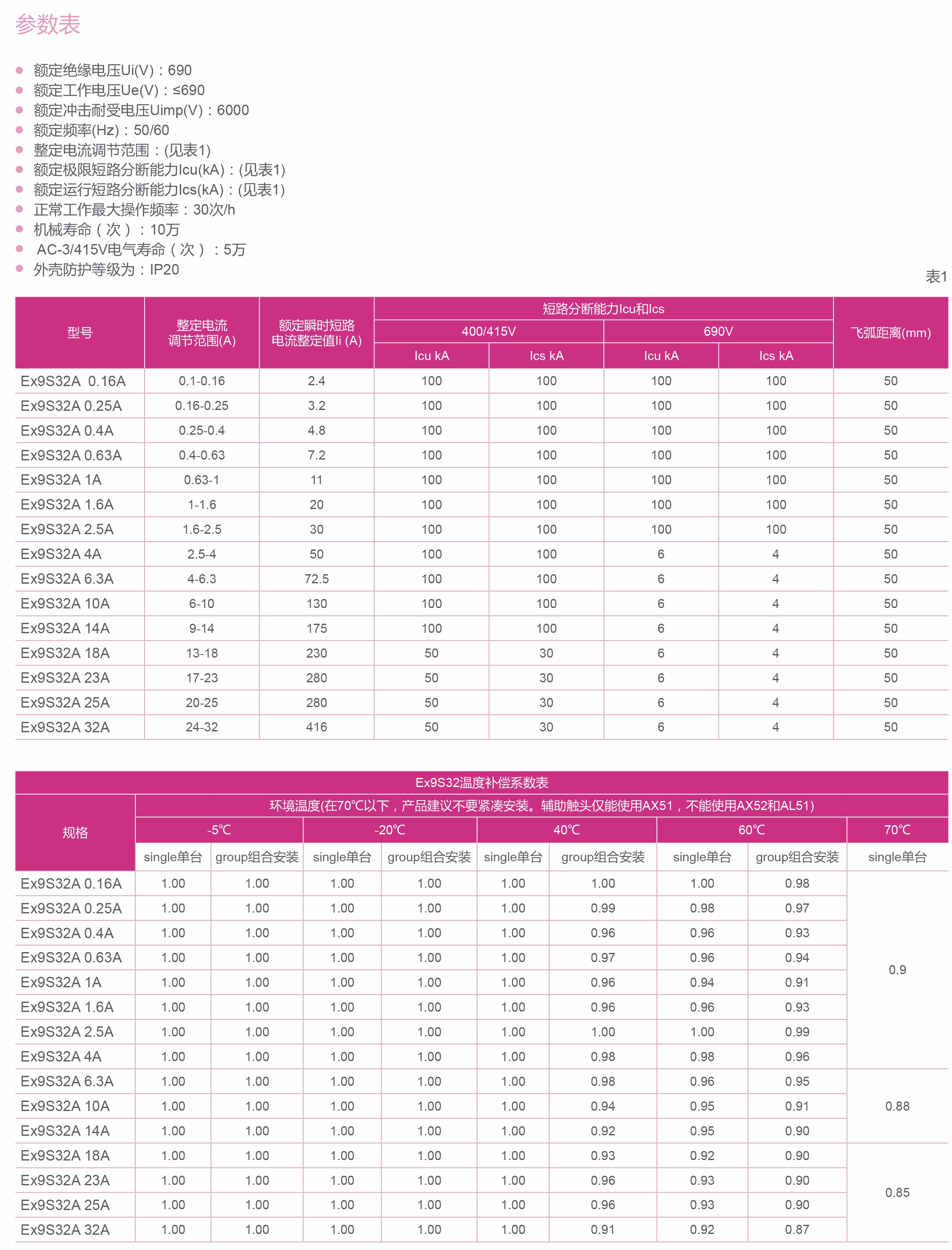 Ex9S断路器保护齐全,采用独特的短路电流机构设计,在保护过载、短路、断相方面很好地取代了断路器和热继电器的组合,不仅减小了体积还能够节约成本。附件齐全,欠压脱扣器,分励脱扣器、故障报警辅助触头组、瞬间辅助触头等一应俱全,适用于交流50/60Hz,额定工作电压至690V,在AC-3/415V使用类别下额定电流至32A的电路中,用于频繁接通或分断带负荷的交流电路。