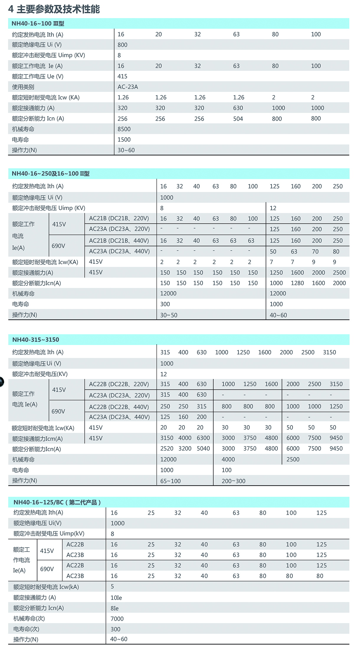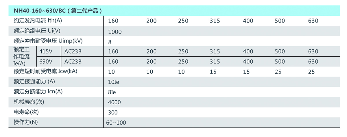 介绍: NH40系列隔离开关,适用于交流50Hz、交流额定电压690V及以下,额定电流至3150A。 在工业企业配电设备中,可供不频繁手动接通和分断电路及隔离电源用,其中125A~630A可作为频繁接通和分断,本系列开关不得作为直接启动单台电动机之用。 符合标准:GB/T 14048.3、IEC 60947-3。