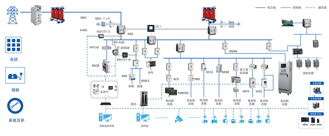 设备层:智能配电设备,主动上报产品日志、预警及故障信息,提高后台信息全面性;具备自诊断功能,提升运维效率; 完善的电动机综合保护功能,和HMI系统管理功能,实现电机的故障预警功能,智能控制; 以综合能源服务为核心,提供光伏系统、风电系统、储能系统及生物质发电等。 网络层:支持多种通信和传输协议,保证设备与上位机可靠连接。 应用层:提供丰富的能源互联网和工业互联网应用,设备自我感知,实现配电物联网平台,提高用户运维效率,让配电更智能,更可靠; 采集水、电、气、新能源、储能等多种能源的数据,建立能源和管理优化