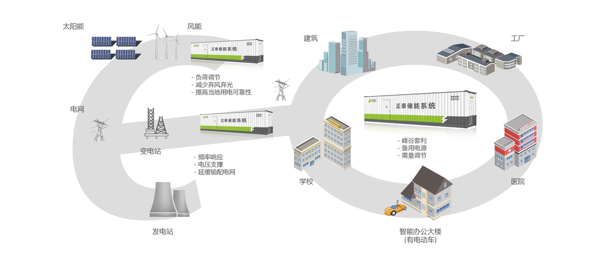 正泰储能技术与系统解决方案包括新能源消纳解决方案、用户侧削峰填谷解决方案、发电侧辅助服务解决方案和微电网解决方案。无论是传统能源的效能提升,还是新能源的开发利用,正泰储能系统在能源的储存和再利用上都能起到关键的作用。