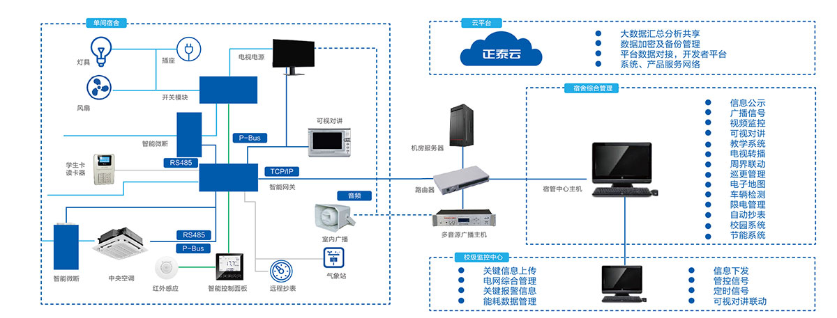 宿舍综合管理平台可以实现宿舍所有用电回路的远程监控,具备恶意负载判断、用电安全预警、限电管理等功能。