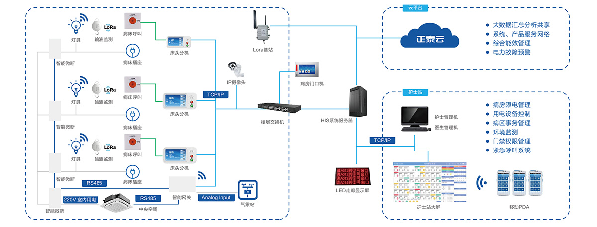 多种通讯协议实现病区状态全感知,实时高效。集成了环境监测、设备用电、呼叫系统,并可通过大数据分析,具备电力故障预警功能。