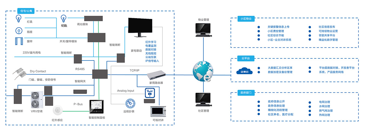 实现居住环境内的灯光、窗帘、空调、门禁系统自动控制,并可实现多种应用场景,智能便捷。