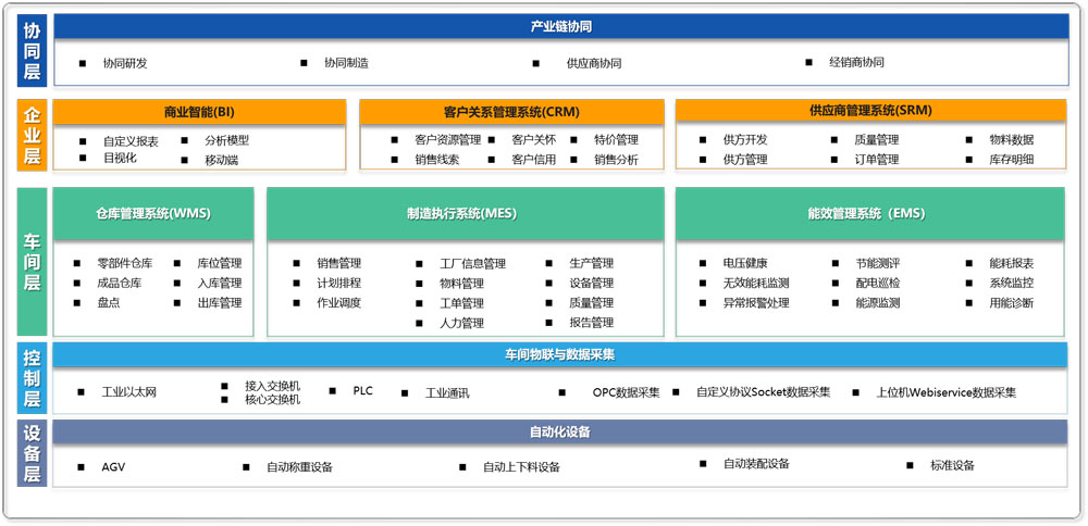车间层:提供MES、WMS、EMS等车间级管理系统解决方案,实现车间层人、机、料、法、环、测的有效管控。