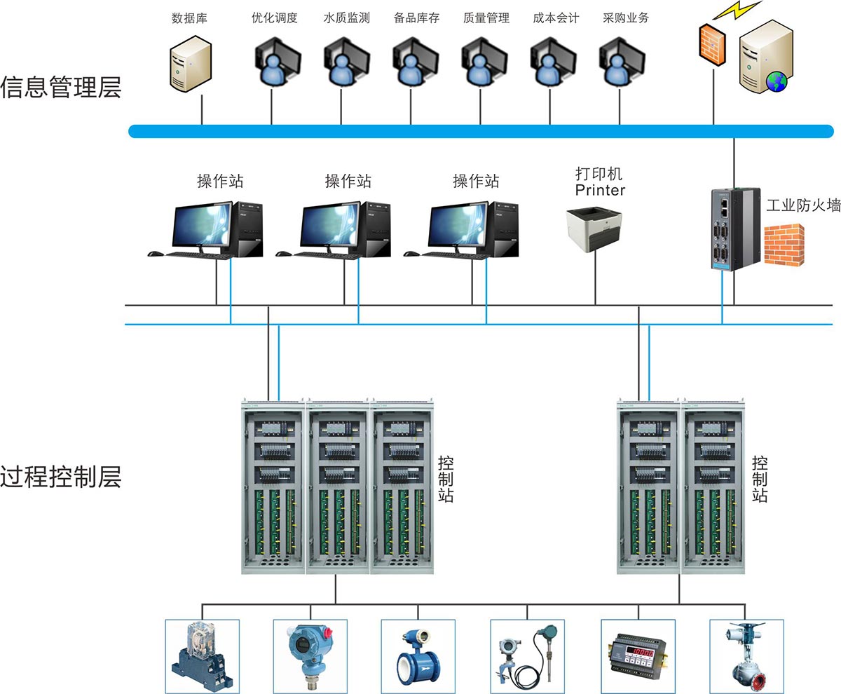 过程控制层:以DCS或PLC为控制核心,控制各个泵站、水处理厂、管网的电气设备、工艺参数。