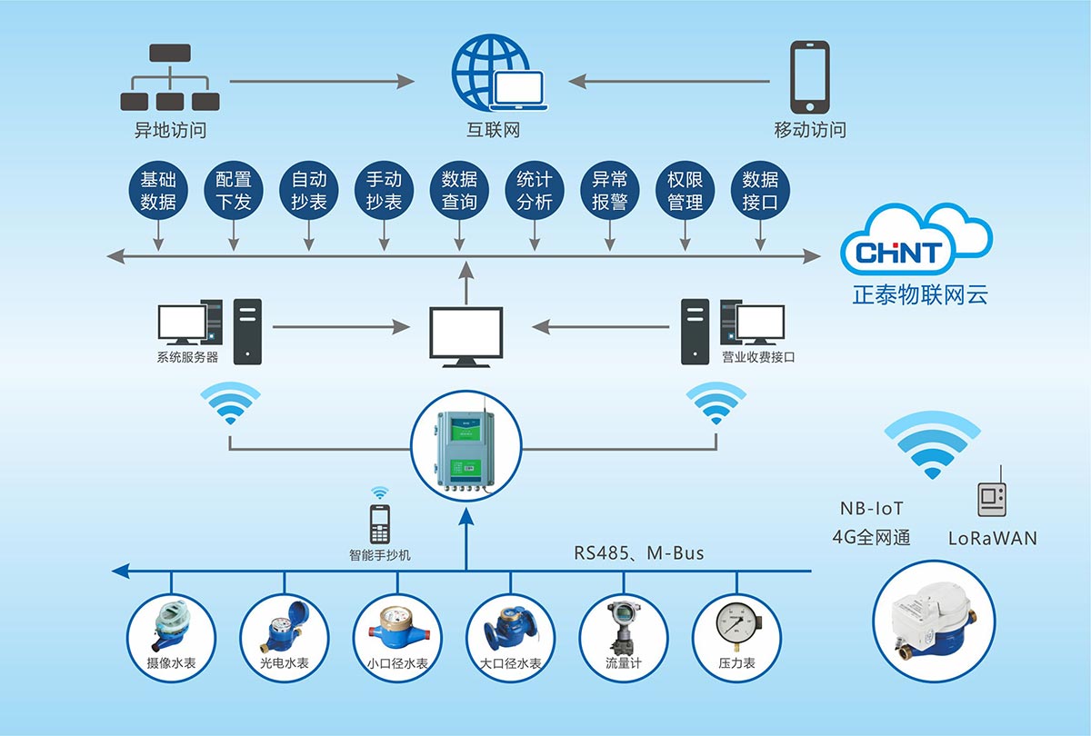智能水表抄表管理平台:是城市用水智能应用及智慧管理的核心部分。借助先进的物联网技术,实现各类智能水表图像或数据采集,以有线或无线方式进行数据传输。管理平台充分应用大数据分析和人工智能技术,在实现水表计量管理的同时,提供数据报表、数据分析及异常警示,为用水管理提供精确、高效的“信息化”管理工具;
