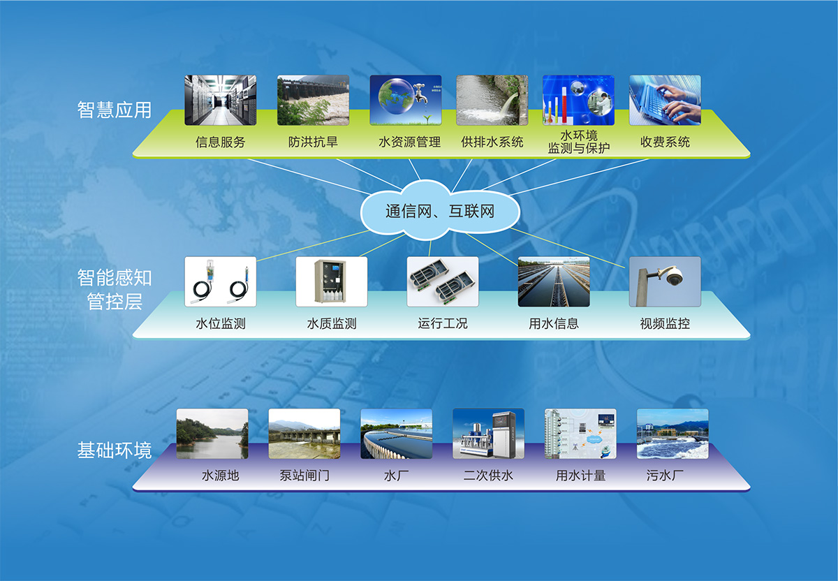 智能感知管控层:对水源地、水厂、管网、污水处理厂、居民用水、城市排涝、海绵城市等水资源环境的数据实现分布式采集和集中监控;采用可视化方式有机整合运营调度部门与供水管网设备,形成统一智慧水务管理平台;对采集到的信息进行及时分析与处理,为水务企业提供决策依据;