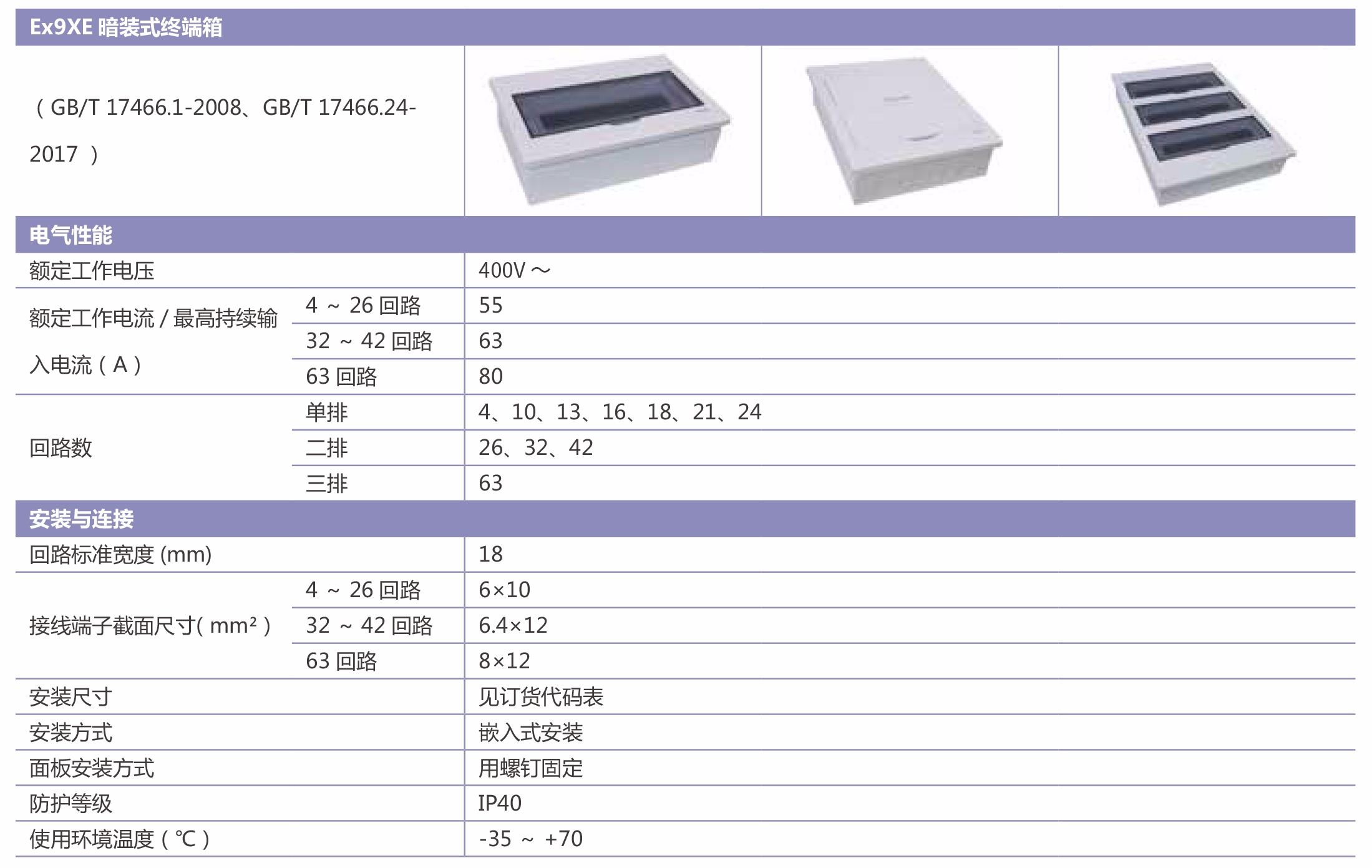 介绍: Ex9XE终端箱额定电流55/63/80A,回路数4~63,安装方式为嵌入式(安装),防护等级IP40。适用于额定电压230V,负载电流不超过80A的终端线路中,作为线路的过载、短路、漏电等保护作用的低压电器的保护装置。广泛应用于宾馆、商场、学校、住宅等建筑场所,适合户内安装。
