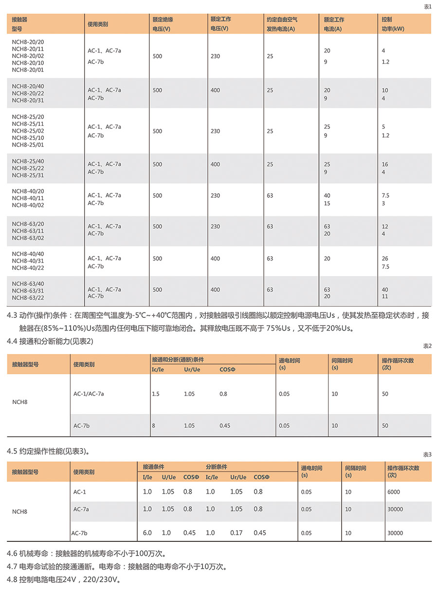 介绍: NCH8系列家用交流接触器(以下简称接触器)主要适用于交流50Hz(或60Hz),额定工作电压至400V额定工作电流至63A的电路中,控制家用电器和类似用途的低感微感负载;也可用来控制家用电动机负载,此时控制功率要相应降低 产品应用于家庭、宾馆、公寓等场所,实现自动化功能,应用于大规模生产的家用电器产品中。符合标准:GB/T 17885、IEC/EN 61095。