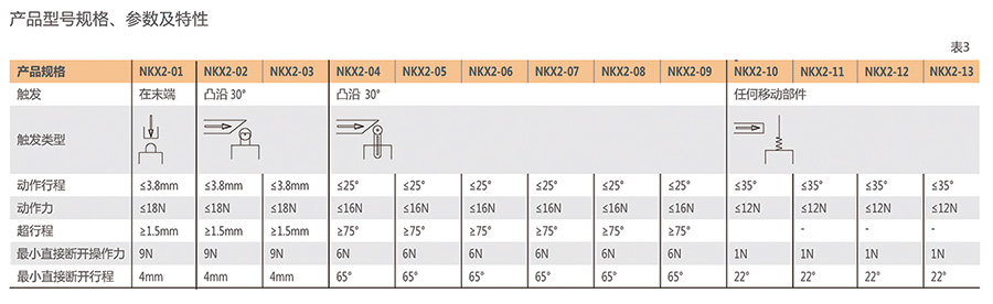 介绍: NKX2系列行程开关主要适用于50Hz或60Hz,交流电压240V、直流电压250V及以下的电气线路中,方向或速度的变换、机床的自动控制、运动机构的限位动作及控制行程。用于纺织、食品、包装、装配、装卸机械、各类机床及医疗器械等领域,作运动机构的行程控制、运动。符合标准:GB/T 14048.5、IEC 60947-5-1